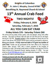 Tickets can be purchased at the main office at St. Raymond Church (after January 12th) with a check (payable to the Knights of Columbus) or cash. We accept credit cards on Sunday mornings from 9:00 to Noon in front of St. Raymond Church, starting January 11, 2026. You can email us at kofc7987@gmail.com with your reservation request. You can follow this link to purchase tickets.