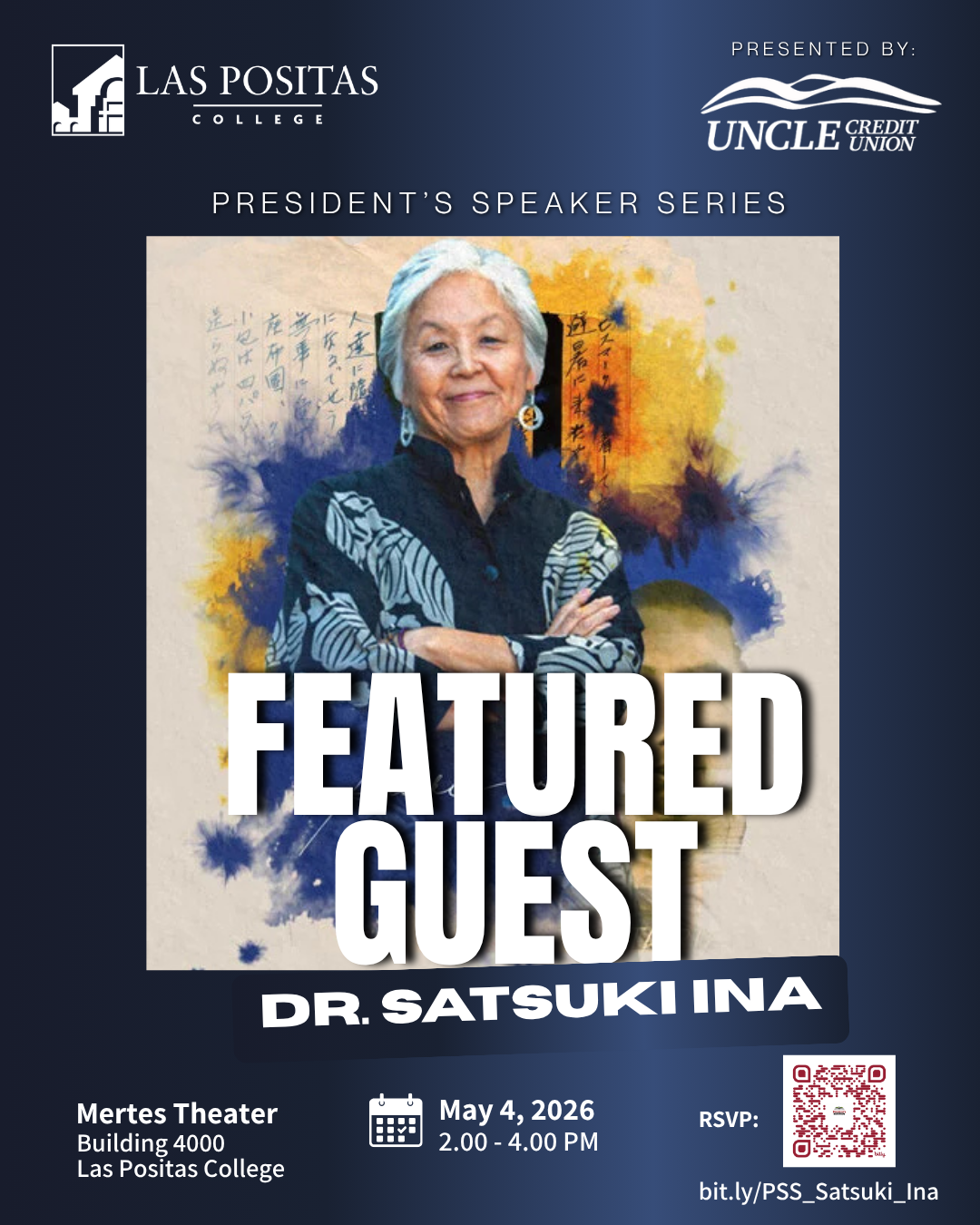 Image description: Image depicts a flier with the Las Positas College logo and Uncle Credit Union logo as well as text reading "President's Speaker Series - Featured Guest Dr. Satsukina." Flier depicts location of the event as Mertes Theater in Building 4000 at Las Positas College and the date/time as May 4, 2026 from 2:00PM-4:00PM. There is a QR code to RSVP linked to bit.ly/PSS_Satsuki_Ina.